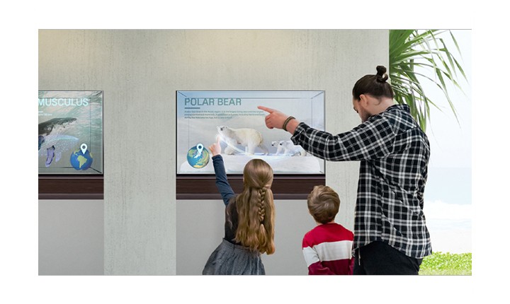 Wysoka przezroczystość Technologia OLED firmy LG sprawia, że przezroczysty wyświetlacz dotykowy OLED ma smuklejszą konstrukcję bez podświetlenia i warstwy ciekłokrystalicznej, osiągając wysoką przezroczystość nawet z folią dotykową P-Cap. Wyświetlając wyraźnie obiekty znajdujące się za ekranem, nakłada na nie odpowiednie informacje. |