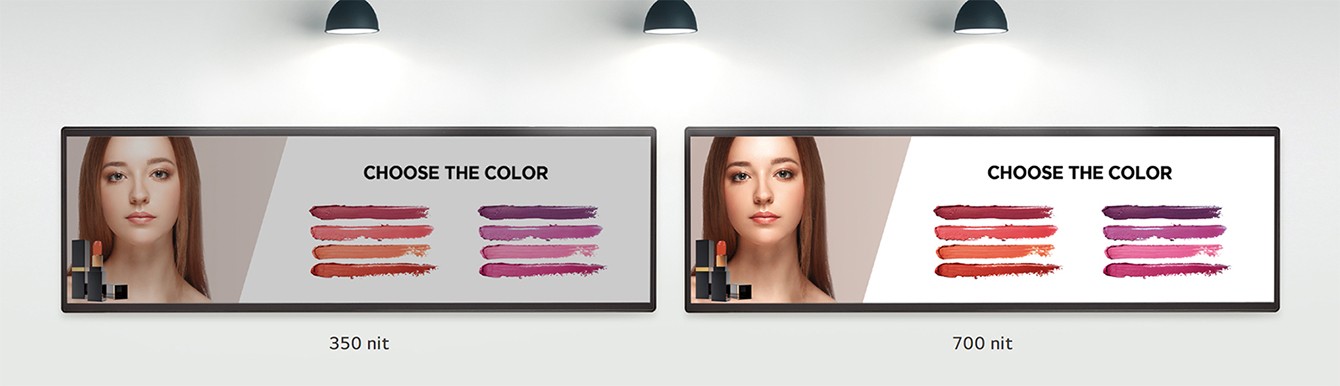Wyświetlacz wewnętrzny zapewniający żywe i ostre wrażenia wizualne Dzięki doskonałej jasności 700 cd/m2 seria BH7N wyraźnie wyświetla treści i przyciąga uwagę publiczności, dzięki czemu nadaje się do marketingu na lotniskach, w sklepach detalicznych, centrach handlowych itp.