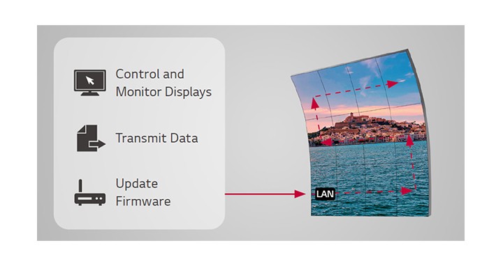 Zarządzanie łańcuchem LAN Łańcuch LAN umożliwia użytkownikom sterowanie i monitorowanie wyświetlaczy, przesyłanie danych, a nawet aktualizowanie oprogramowania sprzętowego jednocześnie, co zmniejsza obciążenie związane z zarządzaniem. |